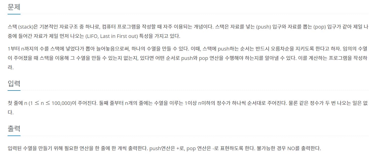 if(!stack.isEmpty()) {// 스택이 비어있지 않으면 '수열을 만들지 못했다'는 의미