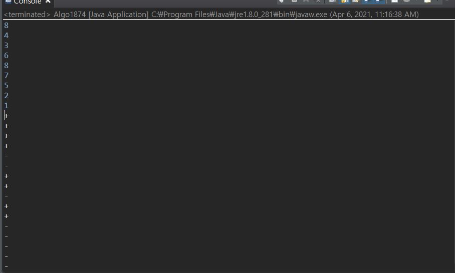 1부터 차례대로 push, push, push, push, push, push, pop이므로 +,+,+,+,+,+,- 가 되겠죠?