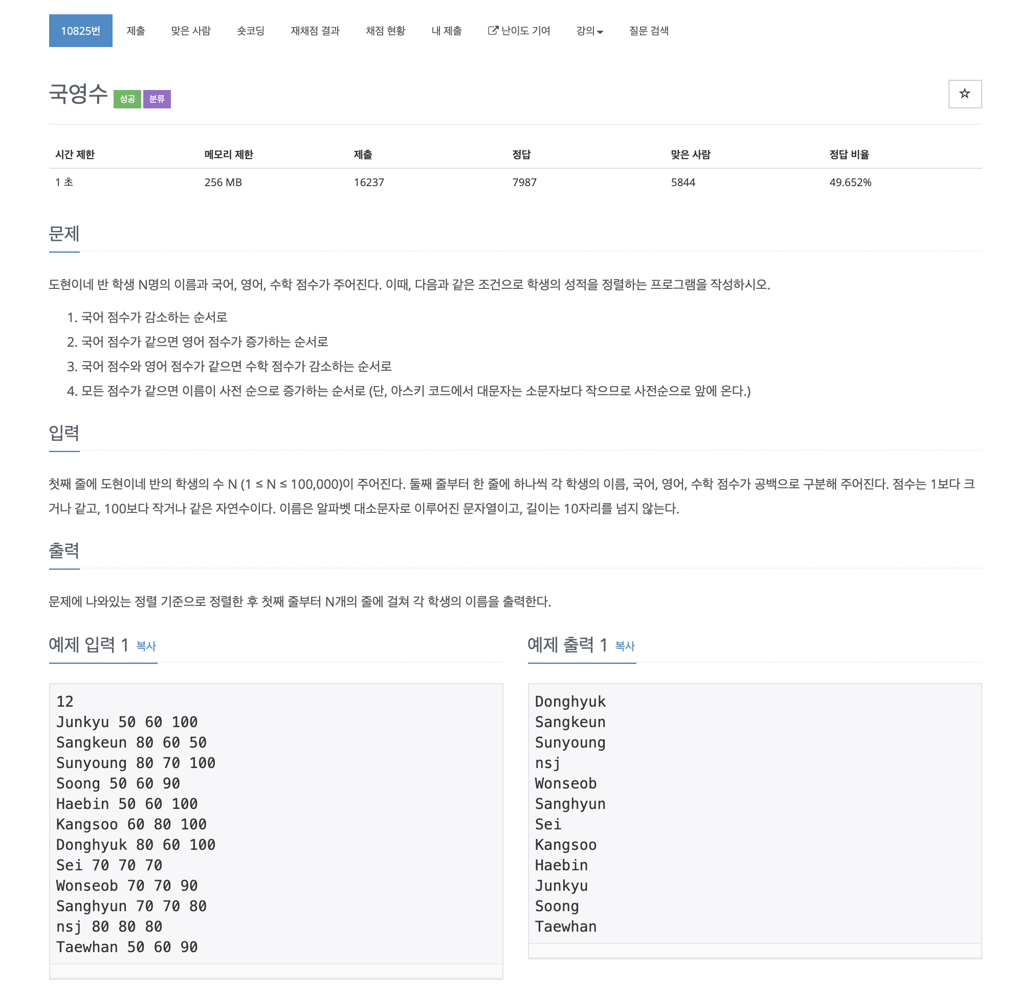 //4. 모든 점수가 같으면 이름이 사전 순으로 증가하는 순서로 -> 오름차순 / 아스키코드는 대소문자 순서 반대