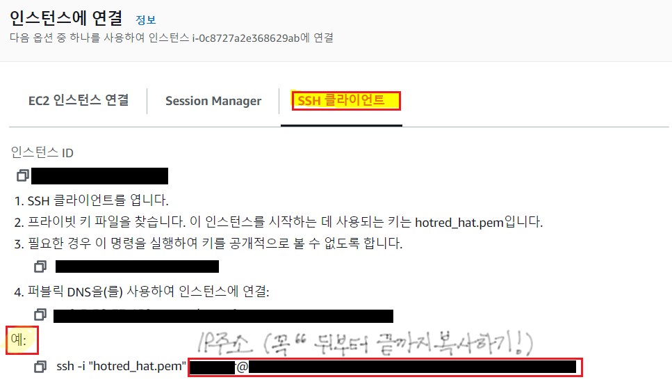 1. AWS에서 준비단계에서 생성한 key 인스턴스ID 연결> SSH 클라이언트 클릭> 예: 의 IP주소 복사