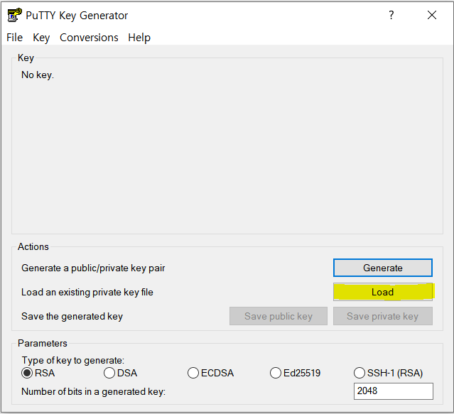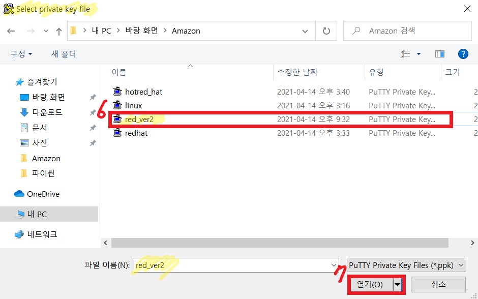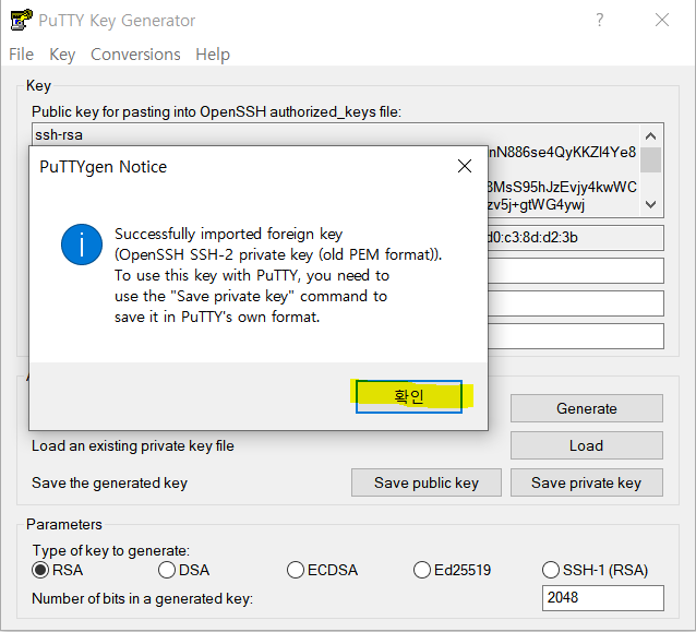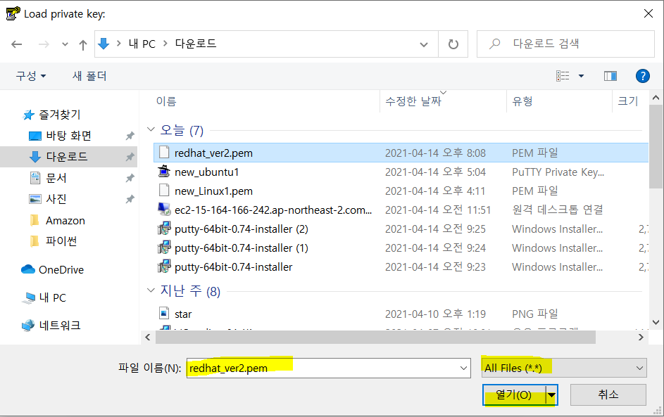 - PuTTY gen을 실행> Load 클릭>파일 확장자명 All Files로 해주기!!> 위에서 만든 키파일 선택>열기 클릭>확인