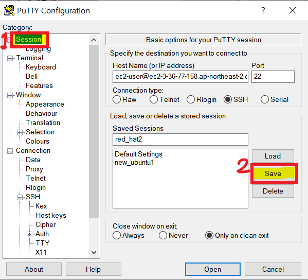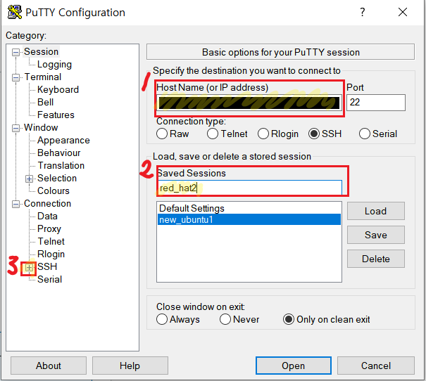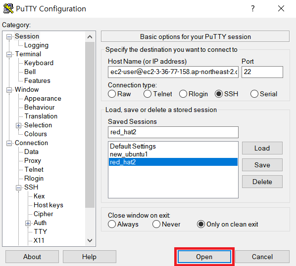2. PuTTY를 실행> Host Name에 IP주소 붙여넣기 > Saved Sessions에 이름쓰기(저는 red_hat2로 지어봤어요!)