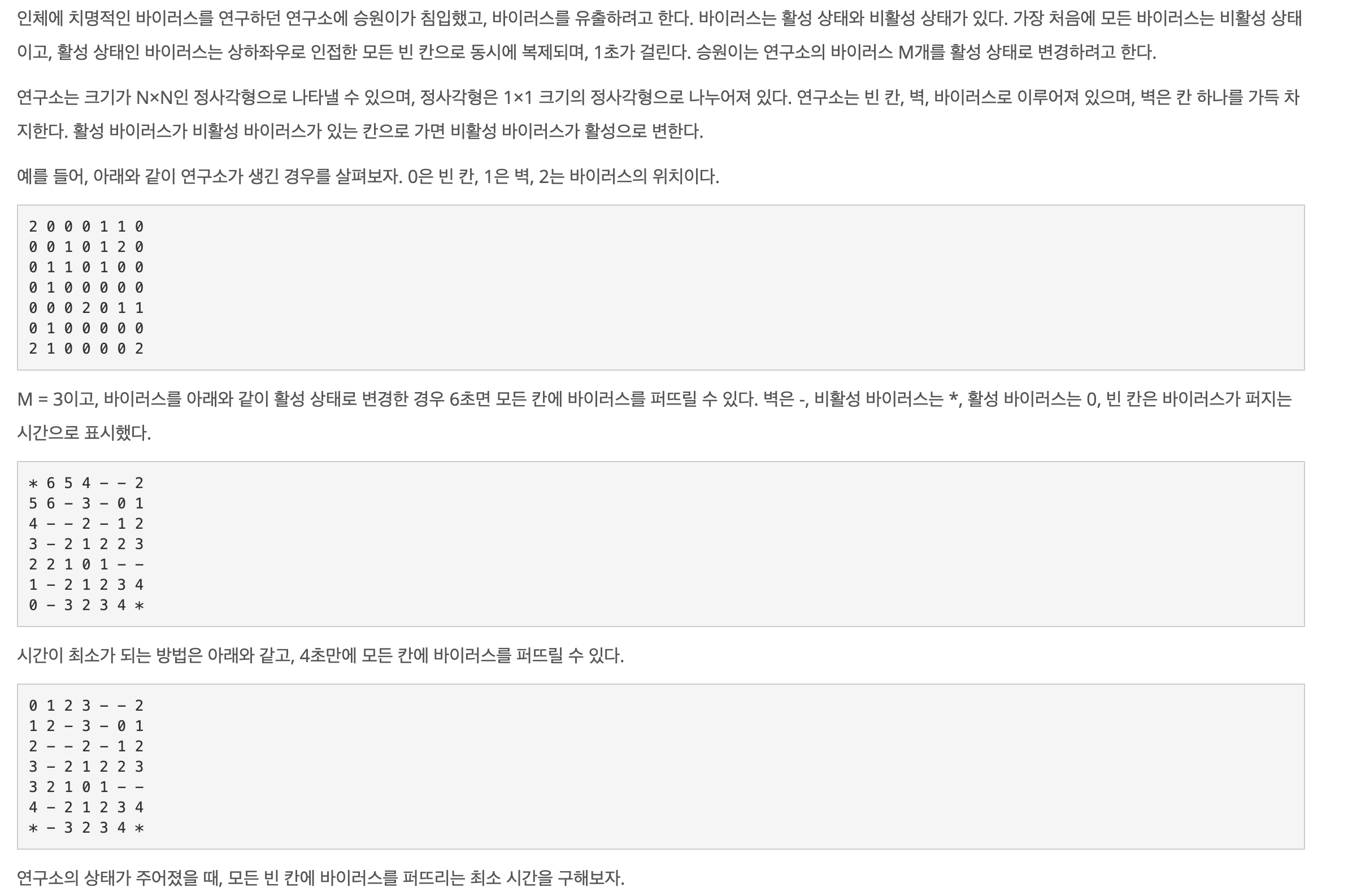 - 첫째 줄에 연구소의 크기 N(4 ≤ N ≤ 50), 놓을 수 있는 바이러스의 개수 M(1 ≤ M ≤ 10)이 주어진다.