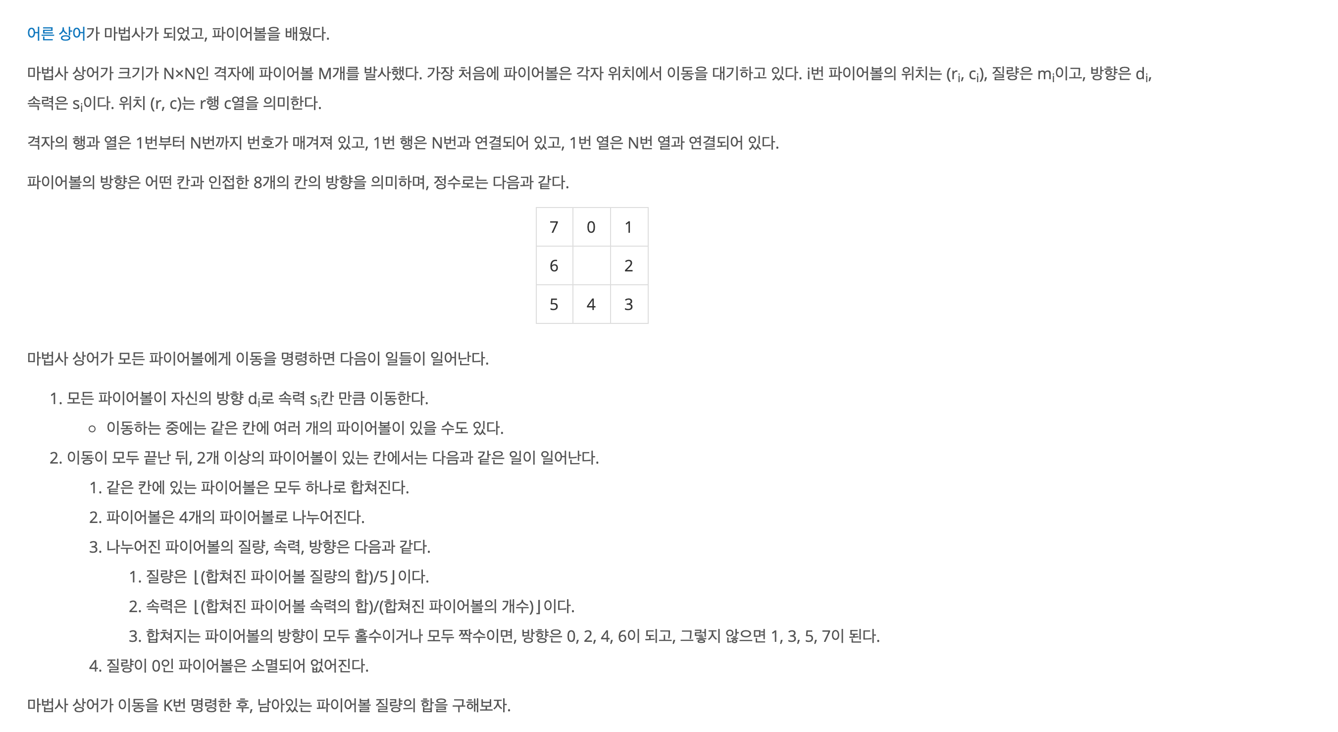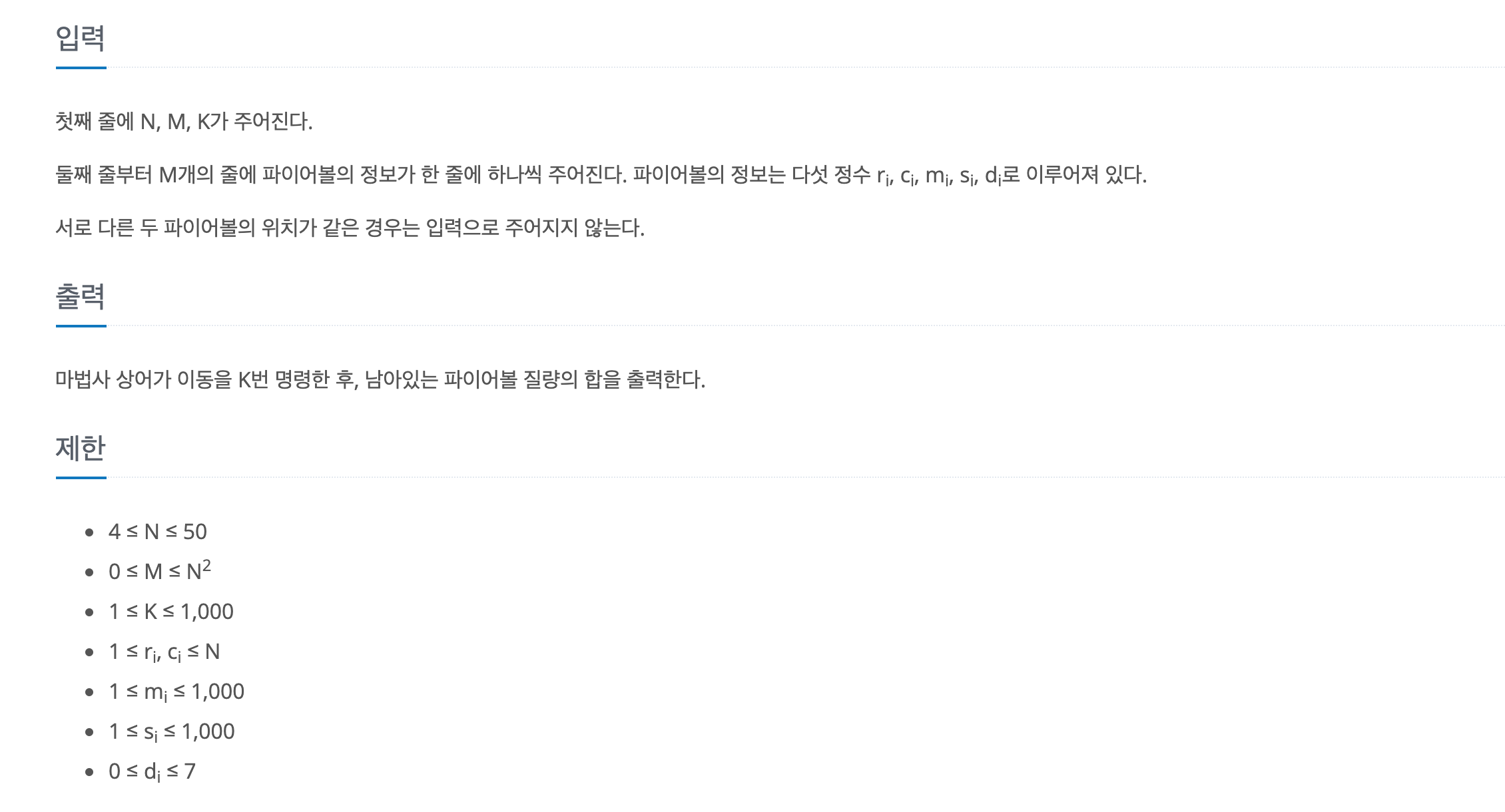 첫째 줄에 N, M, K가 주어진다. 둘째 줄부터 M개의 줄에 파이어볼의 정보가 한 줄에 하나씩 주어진다. 파이어볼의 정보는 다섯 정수 ri, ci, mi, si, di로 이루어져 있다. 서로 다른 두 파이어볼의 위치