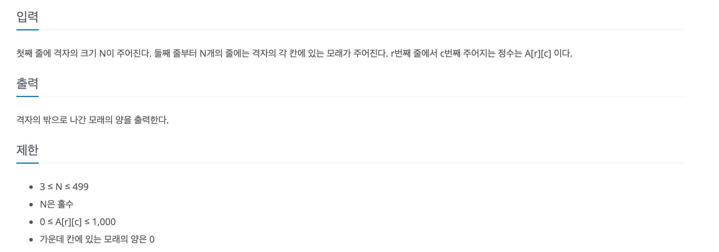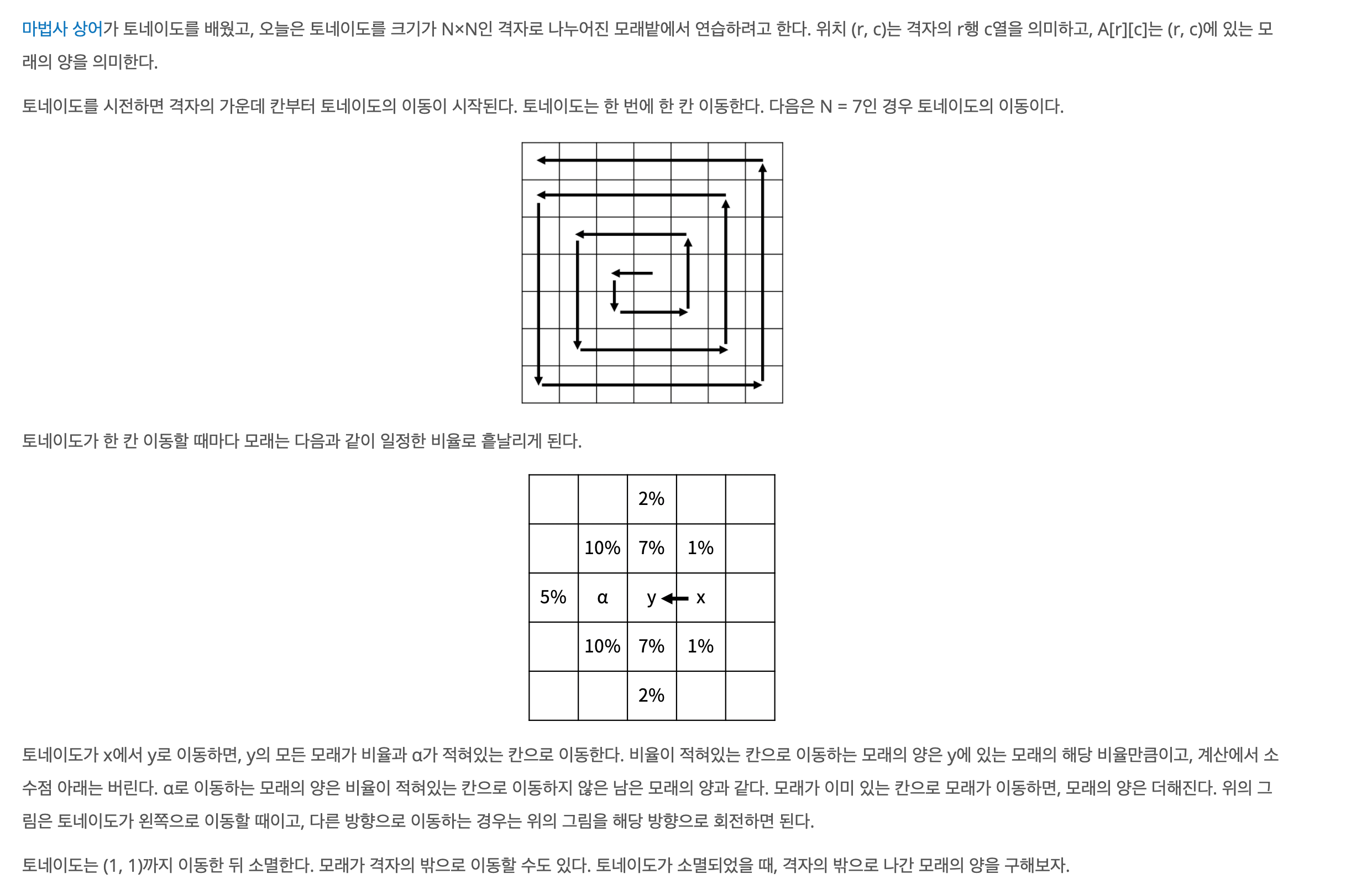 마법사 상어가 토네이도를 배웠고, 오늘은 토네이도를 크기가 N×N인 격자로 나누어진 모래밭에서 연습하려고 한다. 위치 (r, c)는 격자의 r행 c열을 의미하고, A[r][c]는 (r, c)에 있는 모래의 양을