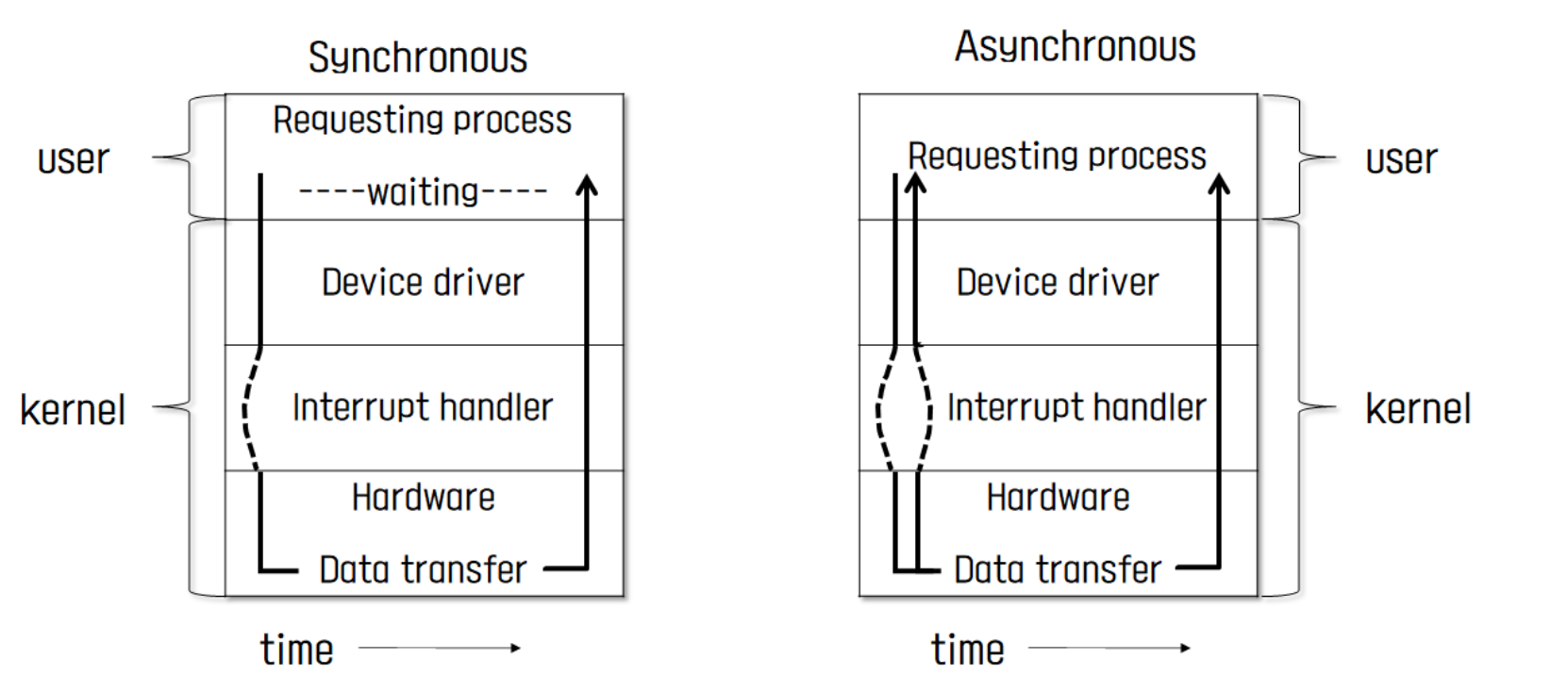 - I/O 요청후 입출력이 완료를 기다리지 않고 제어가 사용자 프로그램으로 넘어감