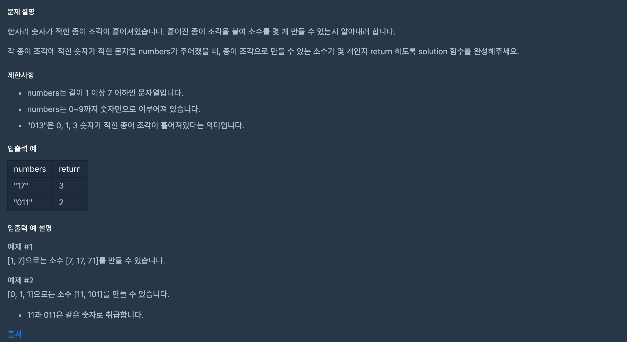 한자리 숫자가 적힌 종이 조각이 흩어져있습니다. 흩어진 종이 조각을 붙여 소수를 몇 개 만들 수 있는지 알아내려 합니다. 각 종이 조각에 적힌 숫자가 적힌 문자열 numbers가 주어졌을 때, 종이