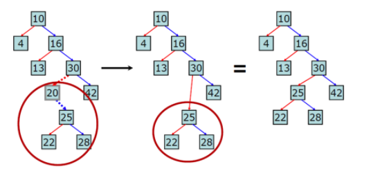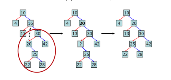 따라서 아래와 같이 삭제할 노드인 16 위치에 20을 복사해 놓고, 기존 20 위치에 있던 노드를 삭제하게 되면 정렬된 순서를 유지(=이진탐색트리 속성을 만족)할수있다.