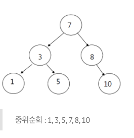 이진탐색트리를 순회할 때는 중위순회(inorder) 방식을 사용한다.(왼=>현재노드=>오른쪽 )