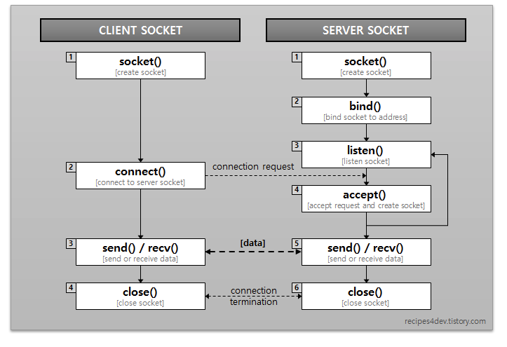 [1]생성(create)한 다음, 서버 측에 [2]연결(connect)서버 소켓에서 연결이 받아들여지면 데이터를 [3]송수신(send/recv)