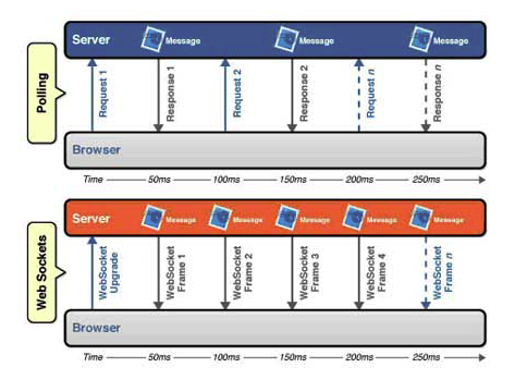 웹 페이지를 만들려면 브라우저와 웹 서버 사이에 더 자유로운 양방향 메시지 송수신(bi-directional full-duplex communication)이