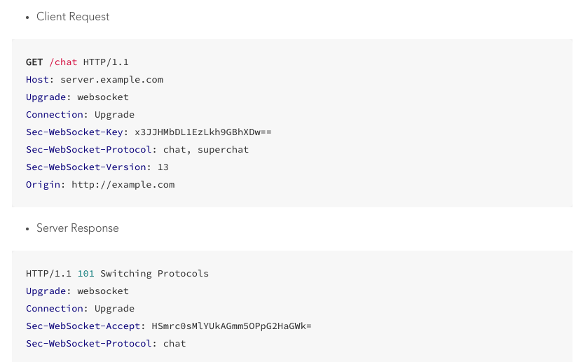 브라우저는 "Upgrade: websocket" 헤더 등과 함께 랜덤하게 생성한 키를 서버에 보낸다. 웹 서버는 이 키를 바탕으로 토큰을 생성한 후 브라우저에 돌려준다. 이런 과정으로 WebSocket 핸드쉐이킹이 이루어진다.