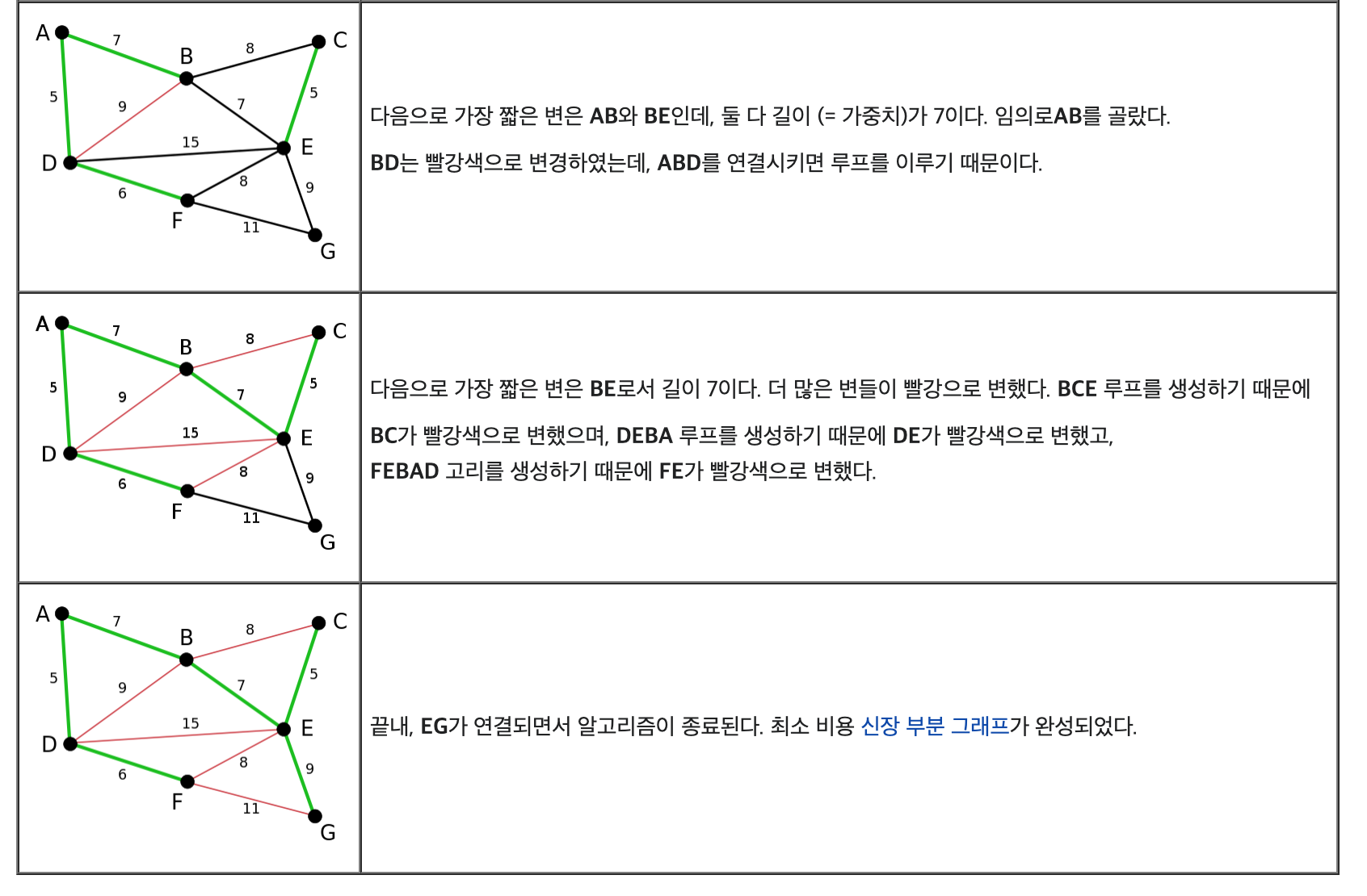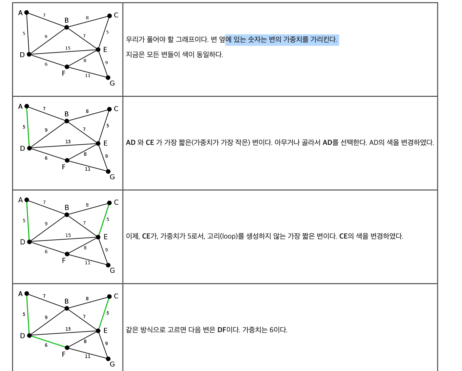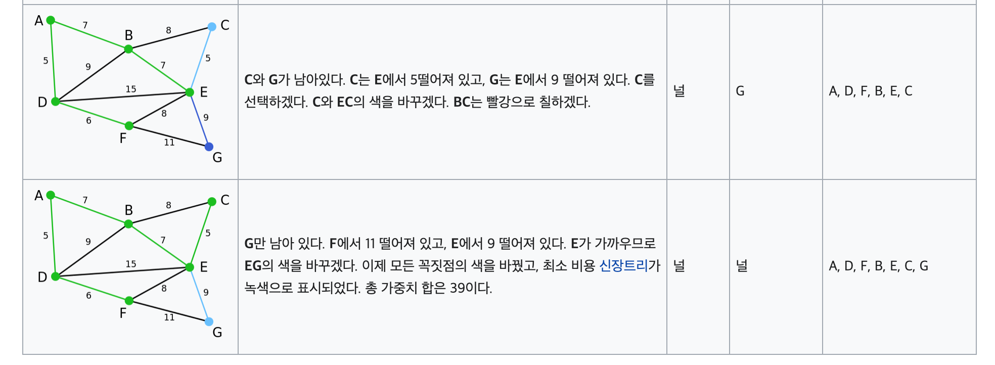 한 정점을 기준으로 가중치가 가장 작은 엣지를 하나 뽑고 이 엣지에 연결된 노드와 해당 엣지를 추가하며 점진적으로 해결하는 방식